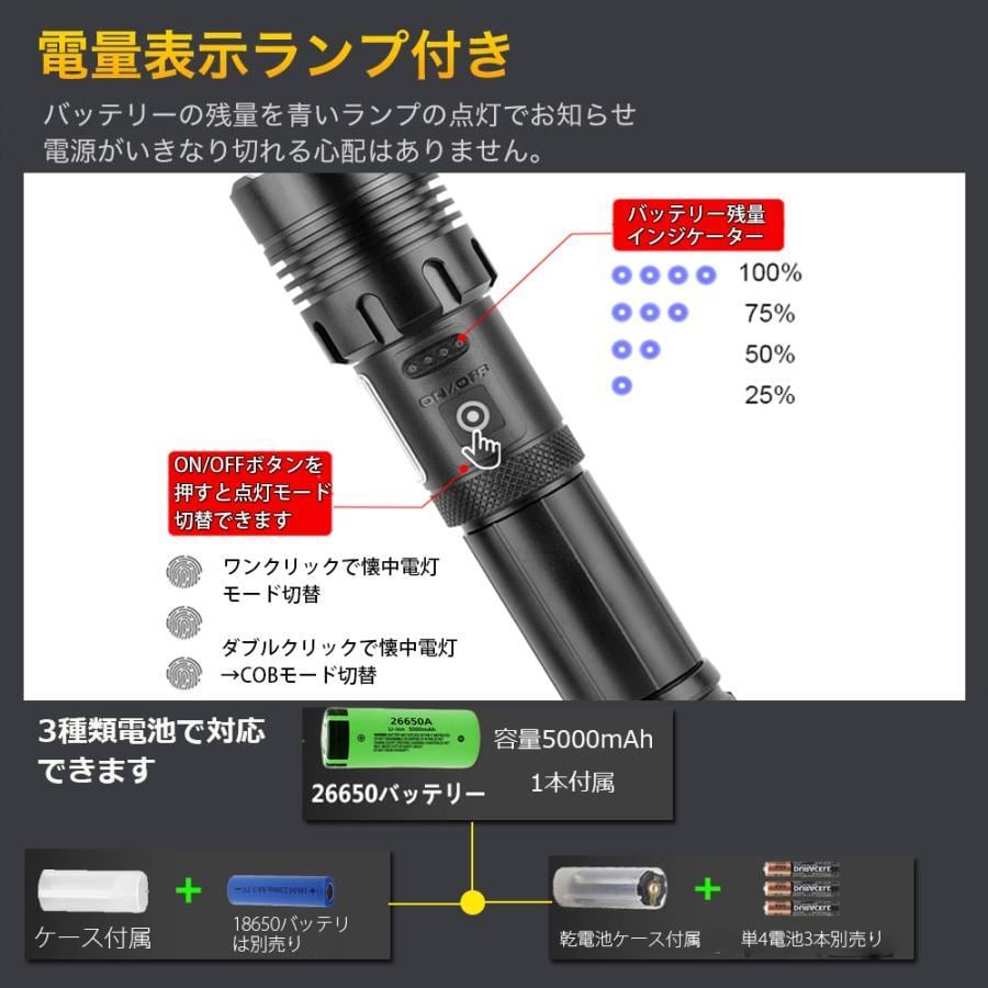 PSE適合で、大容量5000mAhの26650バッテリーが付属しており、USBケーブルを使用して充電できます。