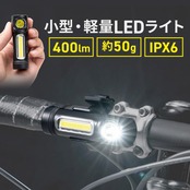 明るさ最大400ルーメンで、充電式のLEDライト。広範囲に照射できるCOB、ピンポイント向きのスポットLEDの2種類搭載。防水規格IPX6。パイプに取り付けができ自転車用にも使用できるバイクアタッチメント付き。マグネット内蔵で磁石での取り付け可能。【WEB限定商品】