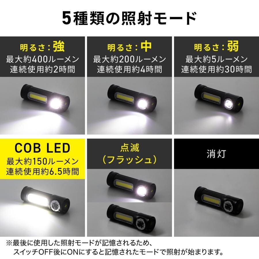LEDライト ハンディライト ワークライト 小型 充電式 マグネット内蔵 防水 IPX6 最大400ルーメン 懐中電灯 強力 防災 停電 地震対策 800-LED064 | ☆ようこそ☆いらっしゃいませ