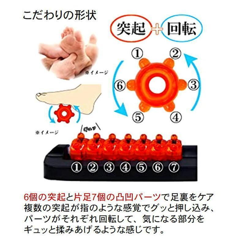 6個の突起と片足7個の凸凹パーツで足裏をケア。複数の突起が指のような感覚でグッと押し込み、パーツがそれぞれ回転して、気になる部分をギュッと揉みあげるような感じです。