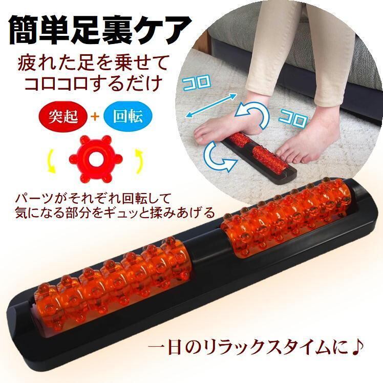 使い方は簡単。突起が付いたローラーに足裏を乗せて、前後に動かすだけ。足裏以外にも気になる所にコロコロ。 テレビを観ながら、読書をしながら、お風呂上りに、スポーツ後のケアに、コロコロ。一日のリラックスタイムのお供に。