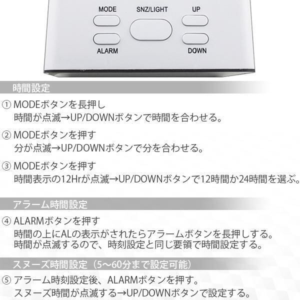 ・アラーム、スヌーズ設定ができます。スヌーズは5から60分まで設定できます。
