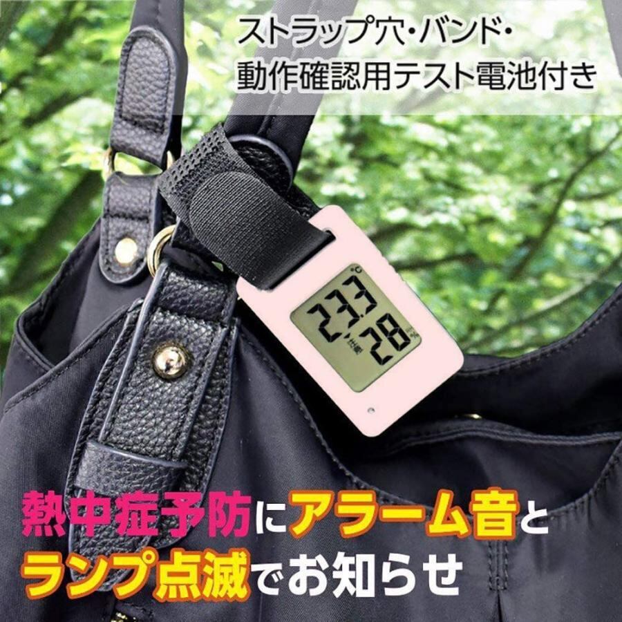 持ち歩きやすいポケットサイズ(39×64×14mm)で外出時に携帯し温湿度の変化がチェックでき、熱中症の予防にも役立ちます。カバンやベビーカーに取り付けが便利なマジックテープのバンド付き。